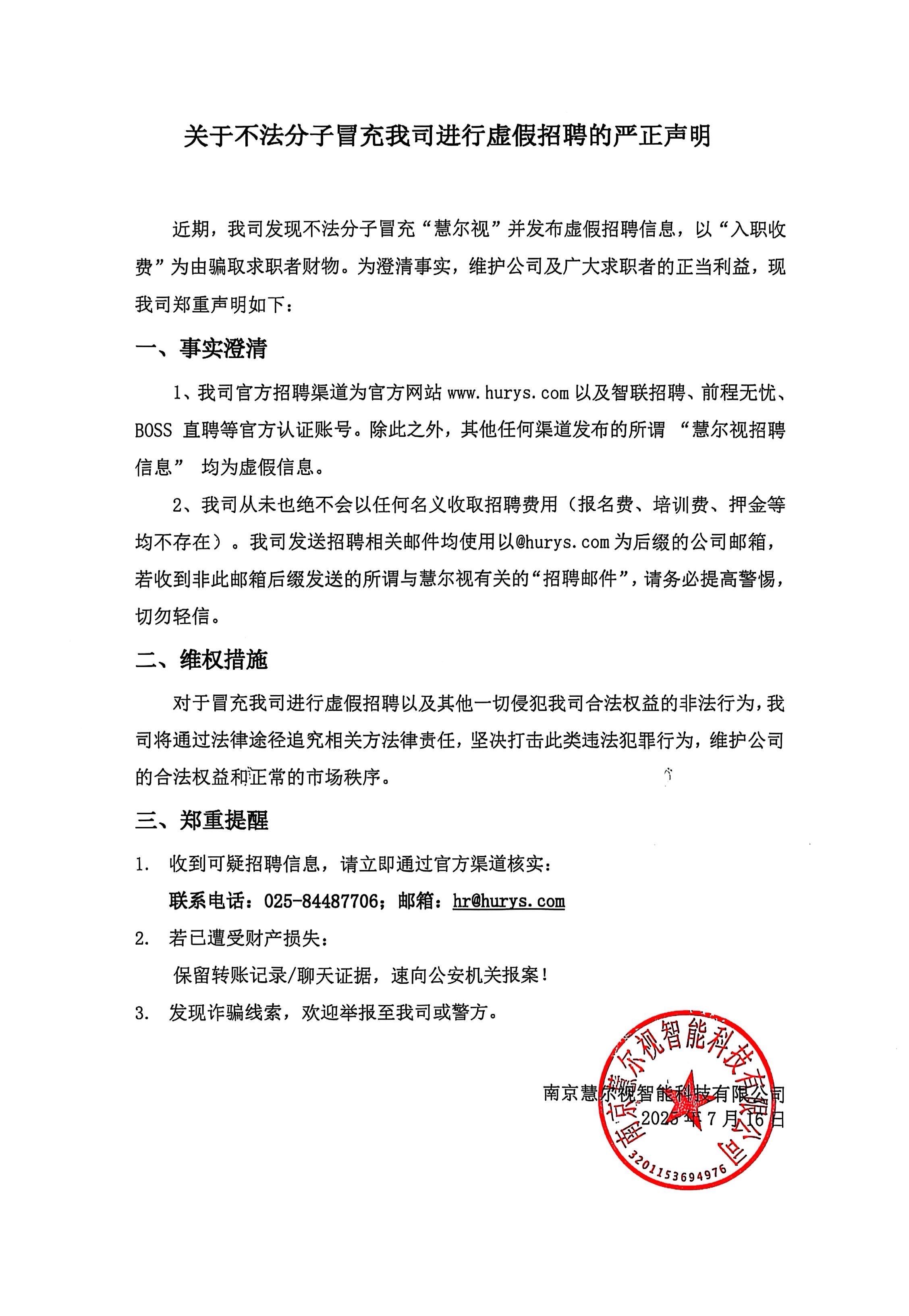 近期,我司發(fā)現(xiàn)不法分子冒充“慧爾視”并發(fā)布虛假招聘信息,以“入職收費(fèi)”為由騙取求職者財(cái)物。為澄清事實(shí),維護(hù)公司及廣大求職者的正當(dāng)利益,現(xiàn)我司鄭重聲明如下: